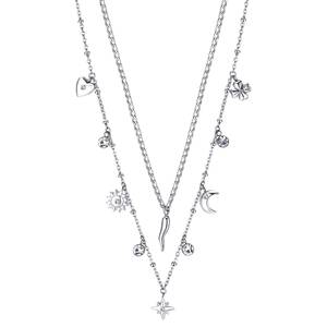 Collana a doppio filo in acciaio 316L con pendenti a forma di cuore, sole, stella, luna, quadrifoglio, cornetto e cristalli.