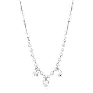 Collana girocollo in acciaio 316L con pendenti a forma di luna, cuore, stella e perle di conchiglia.