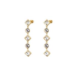 Orecchini pendenti in acciaio 316L e finitura pvd oro 14K con cristalli.