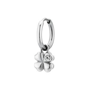 Orecchino singolo a cerchio in acciaio 316L con pendente a forma di quadrifoglio e cristallo.