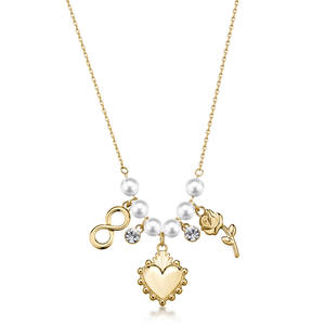 Collana CHAKRA in acciaio 316L, finitura pvd colore oro, con pendenti a cuore e rosa, con cristallo