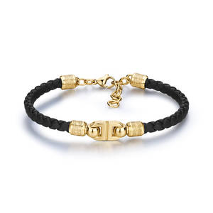 Bracciale in acciaio 316L, finitura pvd oro 14K e cordino in pelle sintetica colore nero.