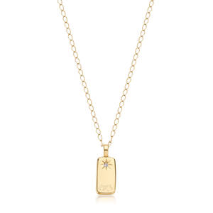 Collana lunga in acciaio 316L, finitura pvd oro 14K e pendente con incisione "LUCK" e cristallo.