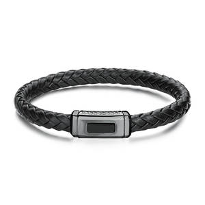 Bracciale in pelle nera con elementi in acciaio 316L e finiture pvd colore rutenio e pvd colore nero.