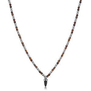 Collana in acciaio 316L, con sfere e pendente a forma di cornetto in occhio di tigre.