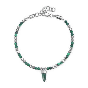 Bracciale in acciaio 316L, con sfere e pendente a forma di cornetto in malachite.