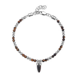 Bracciale in acciaio 316L, con sfere e pendente a forma di cornetto in occhio di tigre.