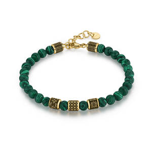 Bracciale in acciaio 316L e finitura pvd oro 14K con smalto nero e sfere in malachite.