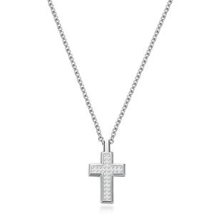 Collana catena lunga in acciaio 316L lucido e sabbiato, con pendente a forma di croce.