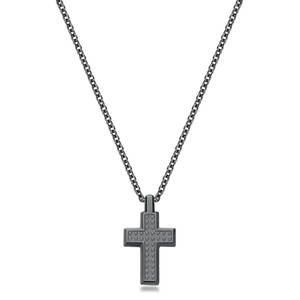 Collana catena lunga in acciaio 316L lucido e sabbiato, con finitura pvd colore rutenio e pendente a forma di croce.