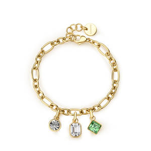 Bracciale in acciaio 316L, finitura pvd oro 14K e pendenti con cristalli chiari e nei colori peridot e light citrine.