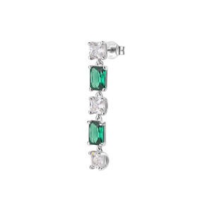 Orecchino singolo pendente in argento rodiato 925‰ con cushion cubic zirconia chiari e baguette cubic zirconia colore emerald.