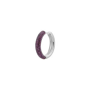 Orecchino singolo a cerchio in argento rodiato 925‰ con galvanica colore rutenio e cubic zirconia colore ruby.
