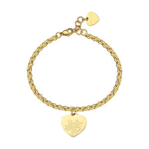 Bracciale catena forzatina in acciaio 316L e finitura pvd oro 14K con pendente a forma di cuore, incisione su fronte a forma di albero della vita e scritta incisa sul retro.
