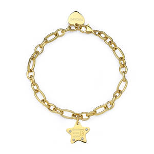 Bracciale catena rolò lavorato in acciaio 316L e finitura pvd oro 14K con pendente a forma di stella, cristalli e scritta incisa.