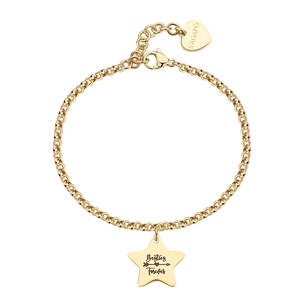 Bracciale in acciaio 316L con finitura pvd oro 14K e pendente a forma di stella con scritta "Besties forever" in smalto nero su fronte e scritta "My best friend" in smalto nero su retro.
