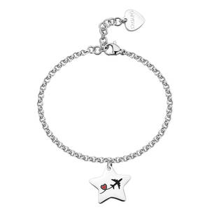 Bracciale in acciaio 316L con pendente a forma di stella con aereo in smalto nero e cuore in smalto rosso su fronte e scritta "Non importa dove vai, ma con chi vai" in smalto nero su retro.
