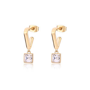 Orecchini pendenti in acciaio 316L e finitura pvd oro 14K con cristalli quadrati pendenti.