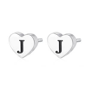 Orecchini a lobo a forma di cuore in acciaio 316L con lettera J e smalto nero.