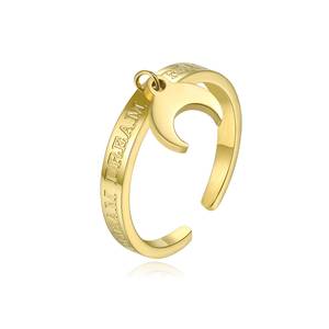 Anello in acciaio 316L, finitura pvd oro 14K con scritta e pendente a forma di luna.
