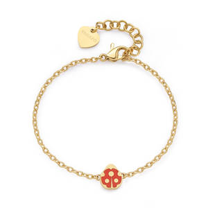 Bracciale in acciaio 316L e finitura pvd oro 14K con pendente a forma di coccinella e smalto rosso.