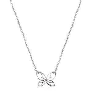 Collana girocollo in acciaio 316L con pendente a forma di farfalla e cristallo.