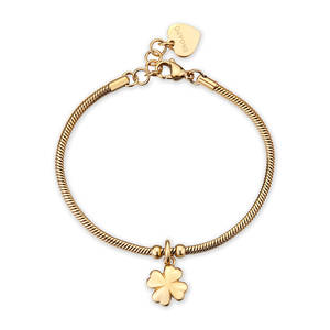 Bracciale in acciaio 316L e finitura pvd oro 14K con pendente a forma di quadrifoglio.
