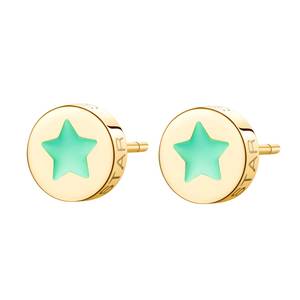 Orecchini a lobo rotondi in acciaio 316L, finitura pvd oro 14K con stella in smalto verde e incisione.