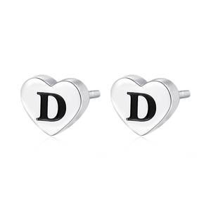 Orecchini a lobo a forma di cuore in acciaio 316L con lettera D e smalto nero.
