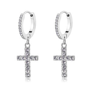 Orecchini a cerchietto in acciaio 316L con pendente a forma di croce e cristalli.