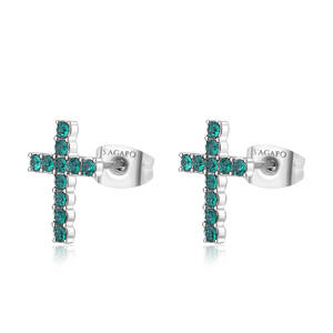 Orecchini a lobo in acciaio 316L a forma di croce con cristalli colore emerald.