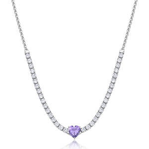 Collana girocollo in acciaio 316L con zirconi chiari e zircone centrale a forma di cuore colore ametista.