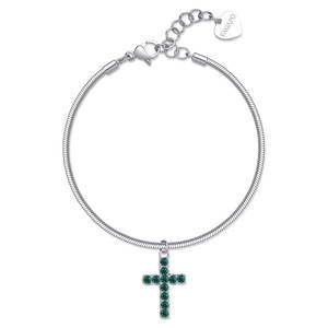 Bracciale in acciaio 316L con pendente a forma di croce con cristalli colore emerald.