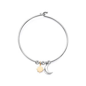 Bracciale rigido in acciaio 316L con sfere in acciaio e pendenti a forma luna e sole con finitura pvd oro 14K.