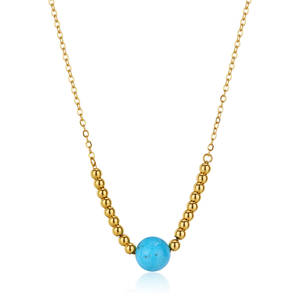 Collana girocollo in acciaio 316L e finitura pvd oro 14K con sfere in acciaio e sfera centrale in turchese ricostruito.