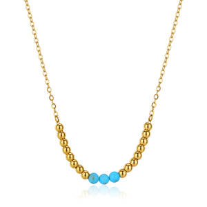 Collana girocollo in acciaio 316L e finitura pvd oro 14K con sfere in acciaio e sfere centrali in turchese ricostruito.