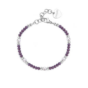Bracciale in acciaio 316L con sfere in vetro viola, acciaio 316L e perle di conchiglia.