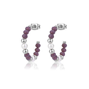 Orecchini a cerchio in acciaio 316L con sfere in vetro viola, acciaio 316L e perle di conchiglia.