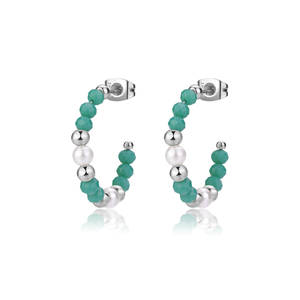 Orecchini a cerchio in acciaio 316L con sfere in vetro verde, acciaio 316L e perle di conchiglia.