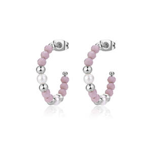 Orecchini a cerchio in acciaio 316L con sfere in rosa, acciaio 316L e perle di conchiglia.