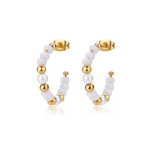 Orecchini a cerchio in acciaio 316L e finitura in pvd oro 14K con sfere in vetro bianco, acciaio 316L e perle di conchiglia.