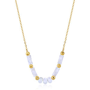 Collana girocollo in acciaio 316L e finitura pvd oro 14K e pietre in madreperla sintetiche.