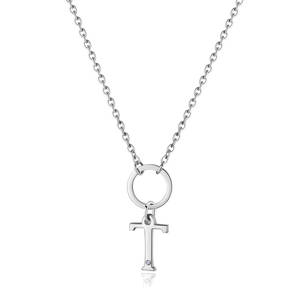 Collana girocollo in acciaio 316L con pendente a forma di lettera T e cristallo.