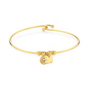 Bracciale rigido in acciaio 316L, finitura pvd oro 14K con pendenti a forma di farfalla e cristallo.