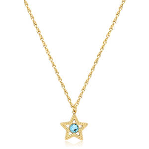 Collana girocollo in acciaio 316L e finitura pvd oro 14K con pendente a forma di stella e cristallo colore aqua bohemica.