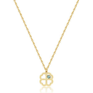 Collana girocollo in acciaio 316L e finitura pvd oro 14K con pendente a forma di quadrifoglio e cristallo colore erinite.