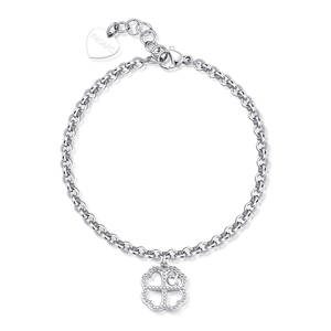 Bracciale in acciaio 316L con pendente a forma di quadrifoglio e cristallo.