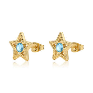 Orecchini a lobo in acciaio 316L e finitura pvd oro 14K a forma di stella con cristalli colore aqua bohemica.