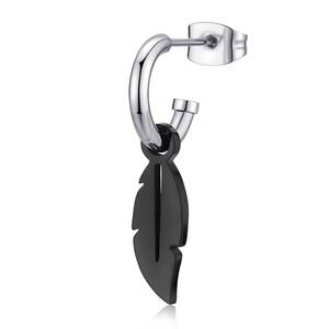 Orecchino singolo a cerchio in acciaio 316L con pendente a forma di piuma in acciaio 316L e finitura pvd colore rutenio.