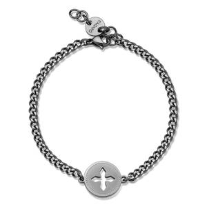 Bracciale in acciaio 316L e finitura pvd colore rutenio con centrale con croce.